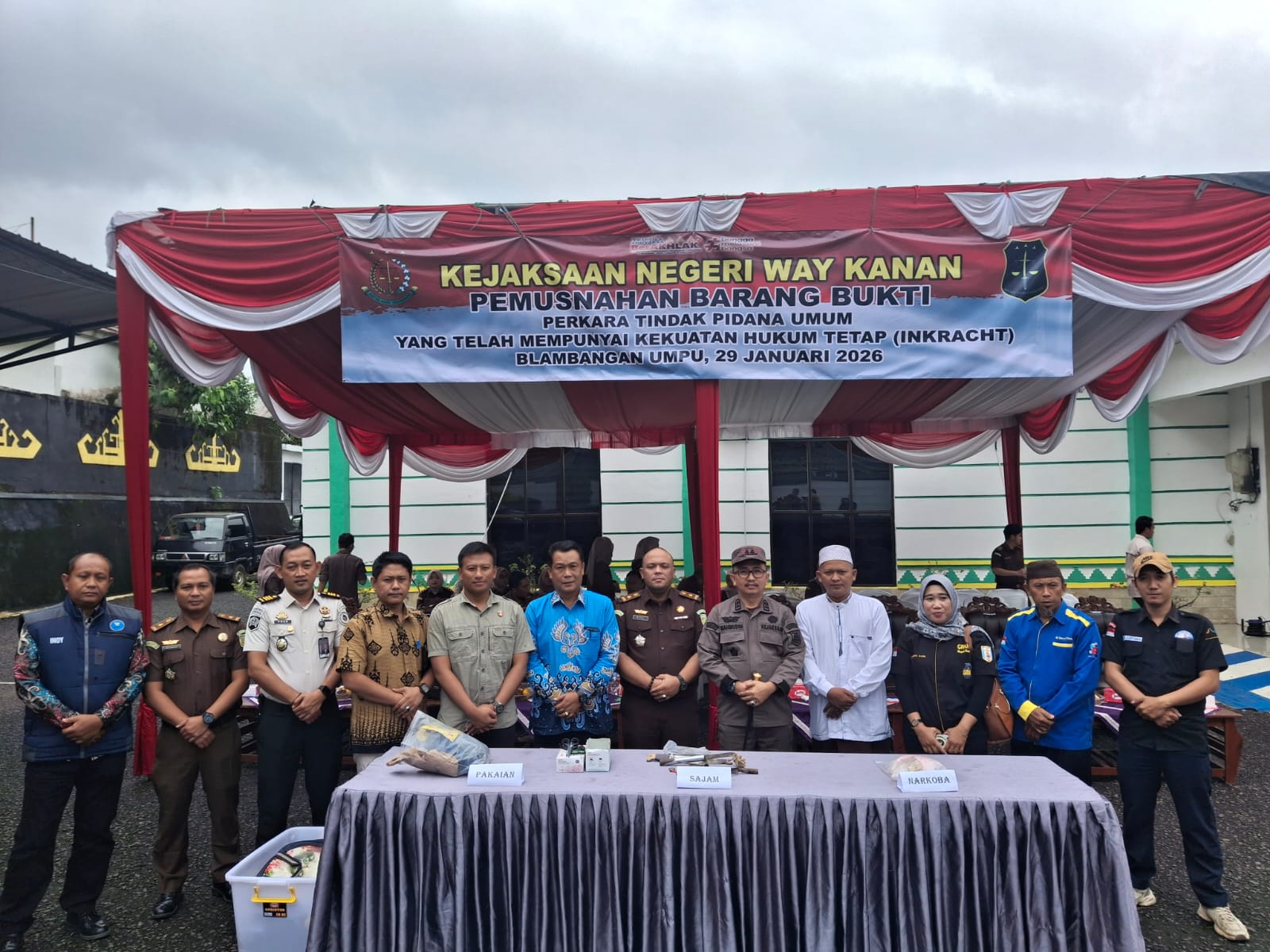 SYAHNEWS.ID – Kejaksaan Negeri Way Kanan melakukan Pemusnahan Barang bukti yang telah mempunyai kekuatan hukum tetap bertempat di Halaman kantor Kejaksaan Negeri setempat Kamis (29-01-2026).